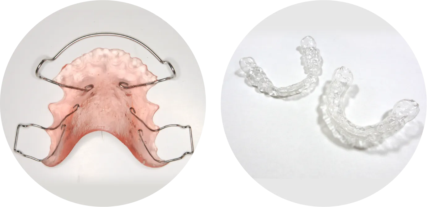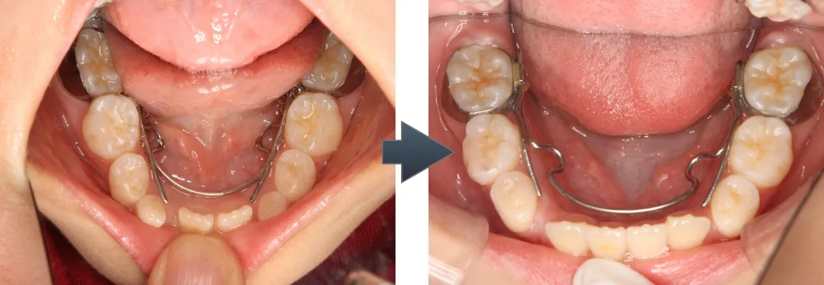 矯正治療は治療終了後の後戻りが大きな問題の一つです。従来の矯正では後戻りを防ぐため右写真のようなリテーナーという装置を長期間装着する必要がありましたが、顎顔面矯正ではあごを大きくしてから並べるので、歯がゆったりと並び位置が安定します。