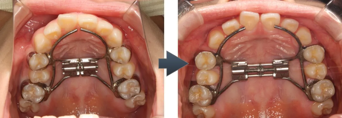 このように、あごを広げると歯がゆったり綺麗に並んでくるようになります。 歯が並ぶスペースができるので、抜歯が必要なくなるのもお分かりいただけるでしょう。 永久が生え揃う12歳くらいまでは、これらの装置を使いあごを大きくすることを目的として治療を行います。 これを一期治療と呼びます。